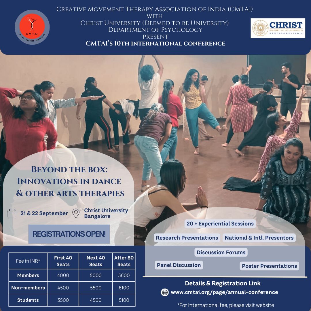 "The `Beyond the Box: Innovations in Dance and Other Arts Therapies´ conference will explore latest trends, techniques, and practices in dance/movement therapy (DMT) and other arts therapies in India and around the world. `The Box´ symbolizes widely-practiced and established methods within creative arts therapies. Stepping out of the box, this conference will explore innovative uses of therapeutic spaces; intersections of mental health, science, and technology; and the integration of techniques across creative arts and related disciplines. Discussions will further delve into the ethical considerations and challenges of incorporating augmented reality, virtual reality, and artificial intelligence into therapy, including how to navigate data privacy, secure consent, and maintain the therapeutic relationship in the digital age. Through presentations and experiential workshops delegates will gain insights into creative methods and case studies, enhancing their knowledge and skills. Practitioners, researchers, and students are invited to contribute to this dynamic discourse on the opportunities and challenges of emerging technologies and practices that will continue to transform creative arts therapies worldwide."